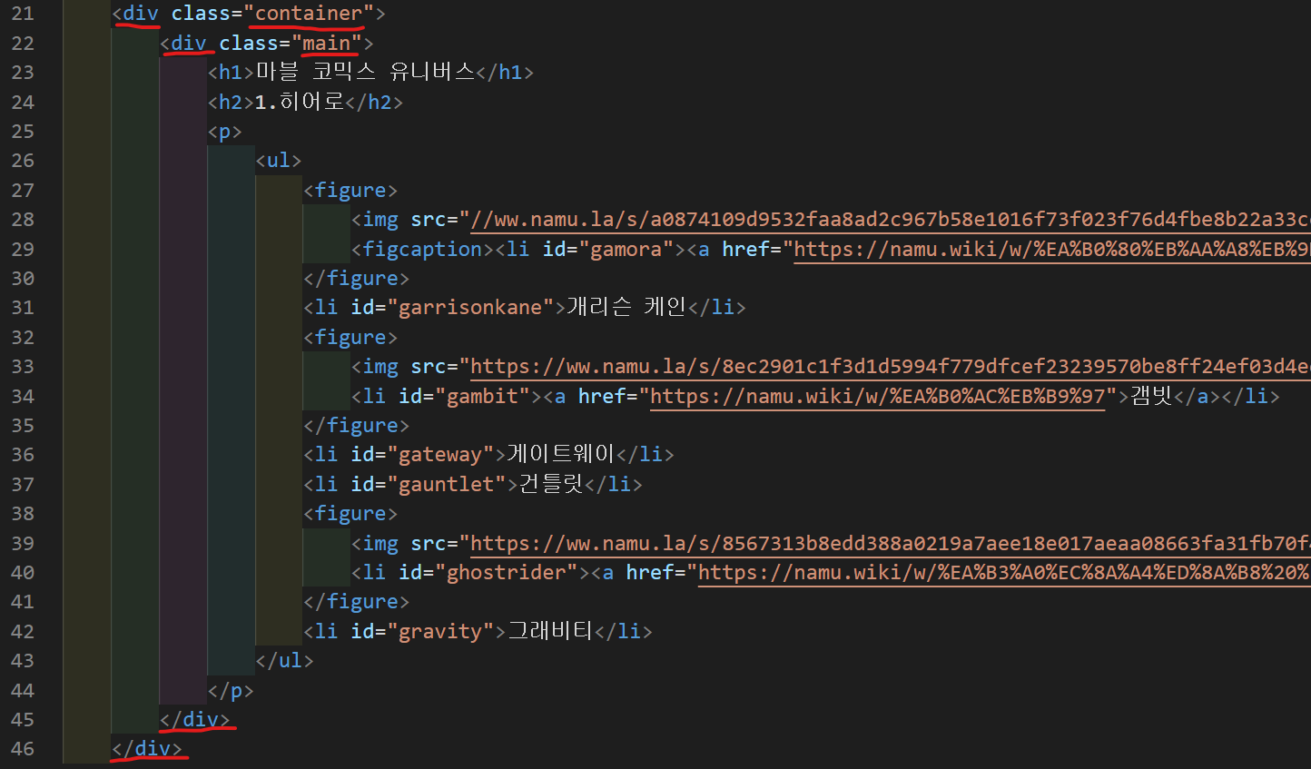 첫 번째 - 두 번째로 <h1>마블 코믹스 유니버스 </h1> 태그부터 <ul></ul> 태그 까지는 <div class="main">과 <div class="container">로 감싸주어서 main.css의 main과 container 부분의 영향을 받게 됩니다.