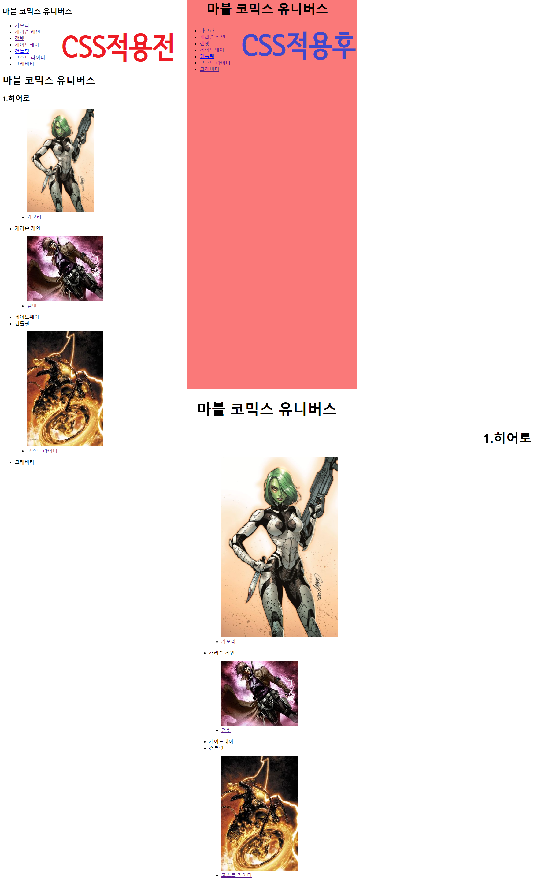 - 첫 번째로 <h2>마블 코믹스 </h2> 태그와 <ul></ul> 태그를 <div class="nav"> 태그로 감싸 주었습니다. 그렇다면 main.css 파일의 nav 부분의 영향을 받게 됩니다.