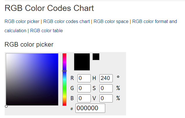 RGB Color Codes Chart RGB color picker | RGB color codes chart | RGB color space | RGB color format and calculation | RGB color table RGB color picker RGB color codes chart Hover with cursor on color to get the hex and decimal color codes below: RGB color