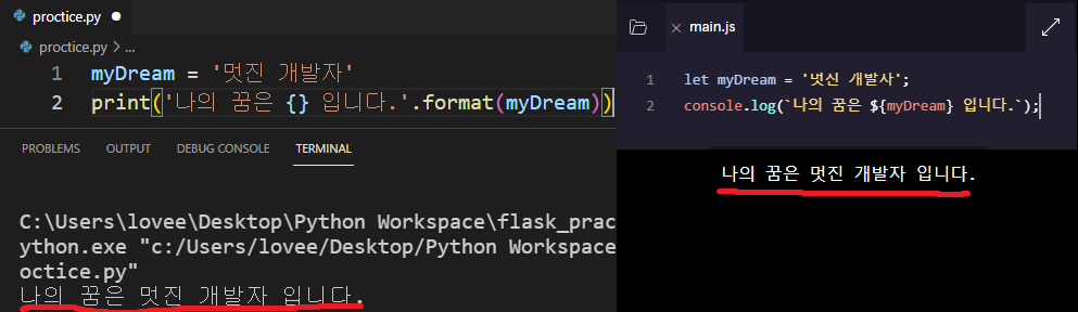 print('나의 꿈은 {} 입니다.'.format(myDream)) # 이 포멧에 관련하여 할말이 더 많은데 자바스크립트 문법을 하는중이니 넘어가겠다.