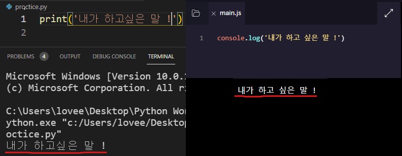자바스크립트에서는 console.log('내가 쓰고 싶은말 !') 이렇게 작성을 하면 다음과 같이 콘솔 또는 터미널 창에 출력이 된다.