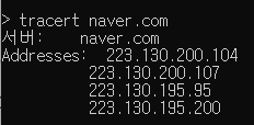 > tracert naver.com이라고 치고 엔터를 누르면