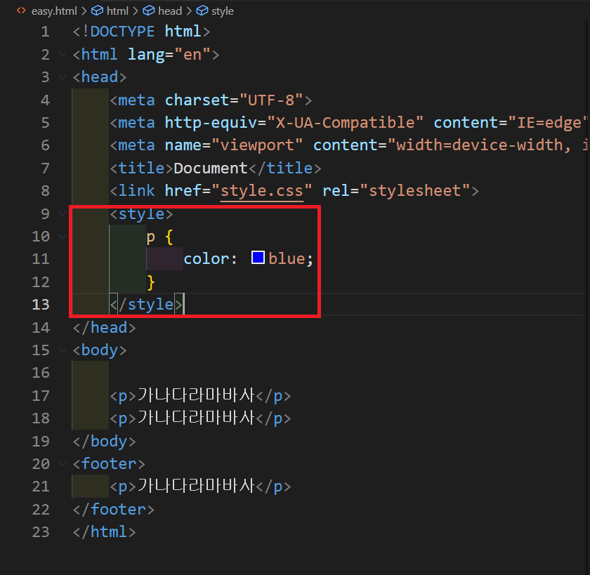 저번 포스팅에서는 인라인에 스타일을 적용해서 해당하는 태그의 스타일만 바꾸어 보았습니다.