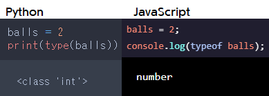 역시 모든 언어에 balls란 변수를 만들고 2를 넣어 타입을 알아 봤더니, 아니? 다른 모습의 결과가 나오는것을 확인 할 수 있습니다. 파이썬은 integer가, 자바스크립트에서는 number 이 출력이 됩니다.