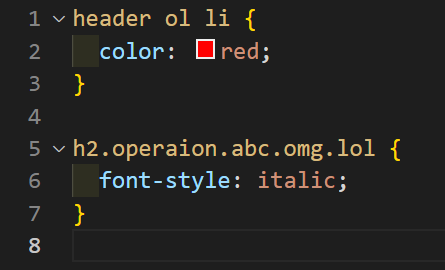 ※CSS 코드를 작성할 때 class가 중첩이 되면 h2.operation.abc.omg.lol와 같은 방법으로 .으로 구분하지만 HTML의 요소가 중첩이 되면 header ol li와 같은 방법으로 공백으로 구분합니다. (이 내용은 다음시간에 자세히 알아봅시다.)