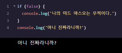 false로 실행한 코드 '나의 미드 야스오는 무적이다'는 출력이 되지 않고 평범한 출력문인 '아니 진짜라니까?'만 출력이 되는 것을 확인할 수 있습니다 ㅠ ㅠ 우리 팀 정글 **********
