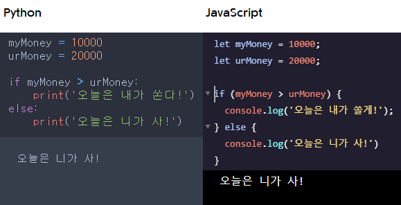 if문을 해석해보자면, "내 돈이 너의 돈보다 많으면 '오늘은 내가 쏜다'를 출력하고 아니라면 '오늘은 니가 사!'를 출력해줘"입니다. 그래서 너의 돈이 20000으로 내 돈 보다 많으므로 '오늘은 니가 사!'가 출력이 된 것을 확인할 수 있습니다.