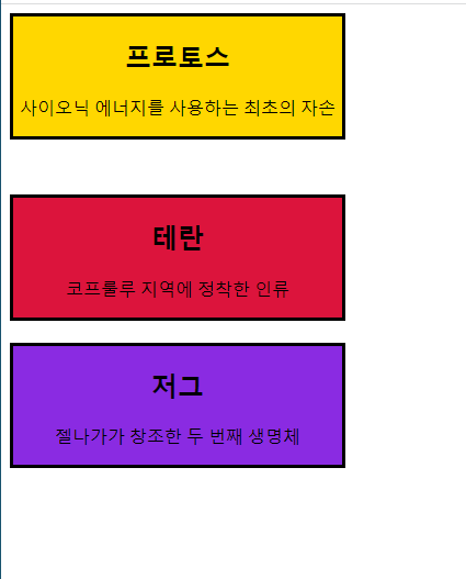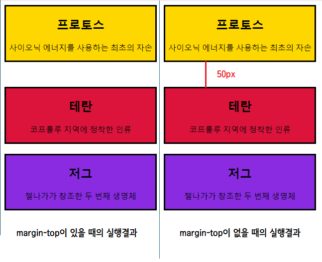 프로토스와 테란의 사이의 거리는 마진은 .protoss { margin-bottom: 50px }와 .terran { margin-top: 20px }를 더하여 70px가 와야 하지만 실행화면에 나온 거리는 사실 50px입니다. 이를 뒷받침하는 증거는 .terran { margin-top: 20px }를 지우고 실행하면 나타납니다.