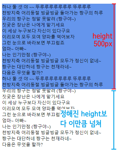 이렇게 넘쳤을 때 overflow: 값;을 넣으면 넘쳐버린 내용에 대한 설정을 할 수 있습니다.