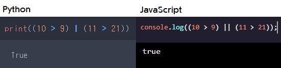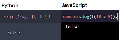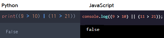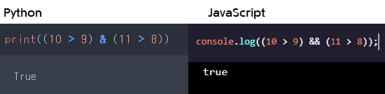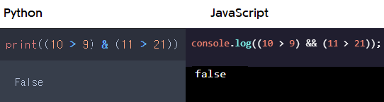 이렇게 양쪽의 값이 모두 참일 때 파이썬과 자바스크립트는 불린(Boolean) 값으로 true를 출력해줍니다. false의 경우도 볼까요?
