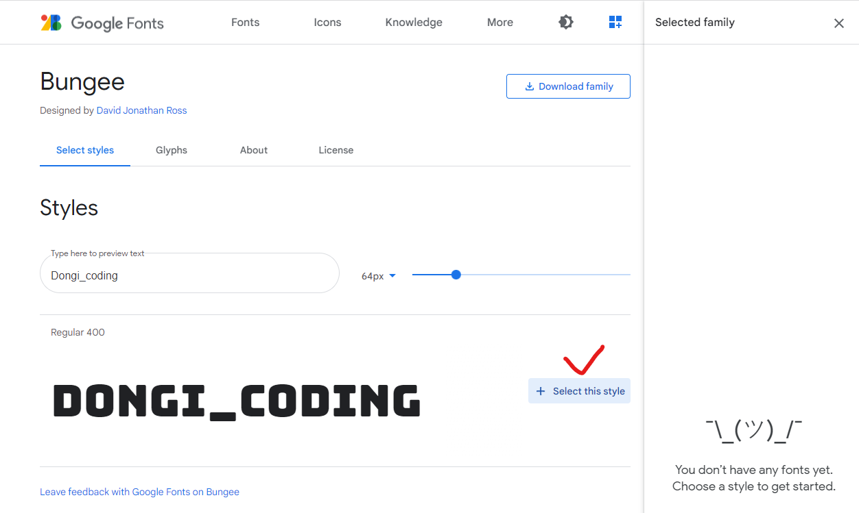 2. 원하는 폰트를 찾습니다. 저는 'Bungee'라는 폰트를 찾아보겠습니다. 그리고 클릭합니다. (뭔가 클래식 게임에 나오는 폰트 같이 생겨서 너무 좋더라구요.)