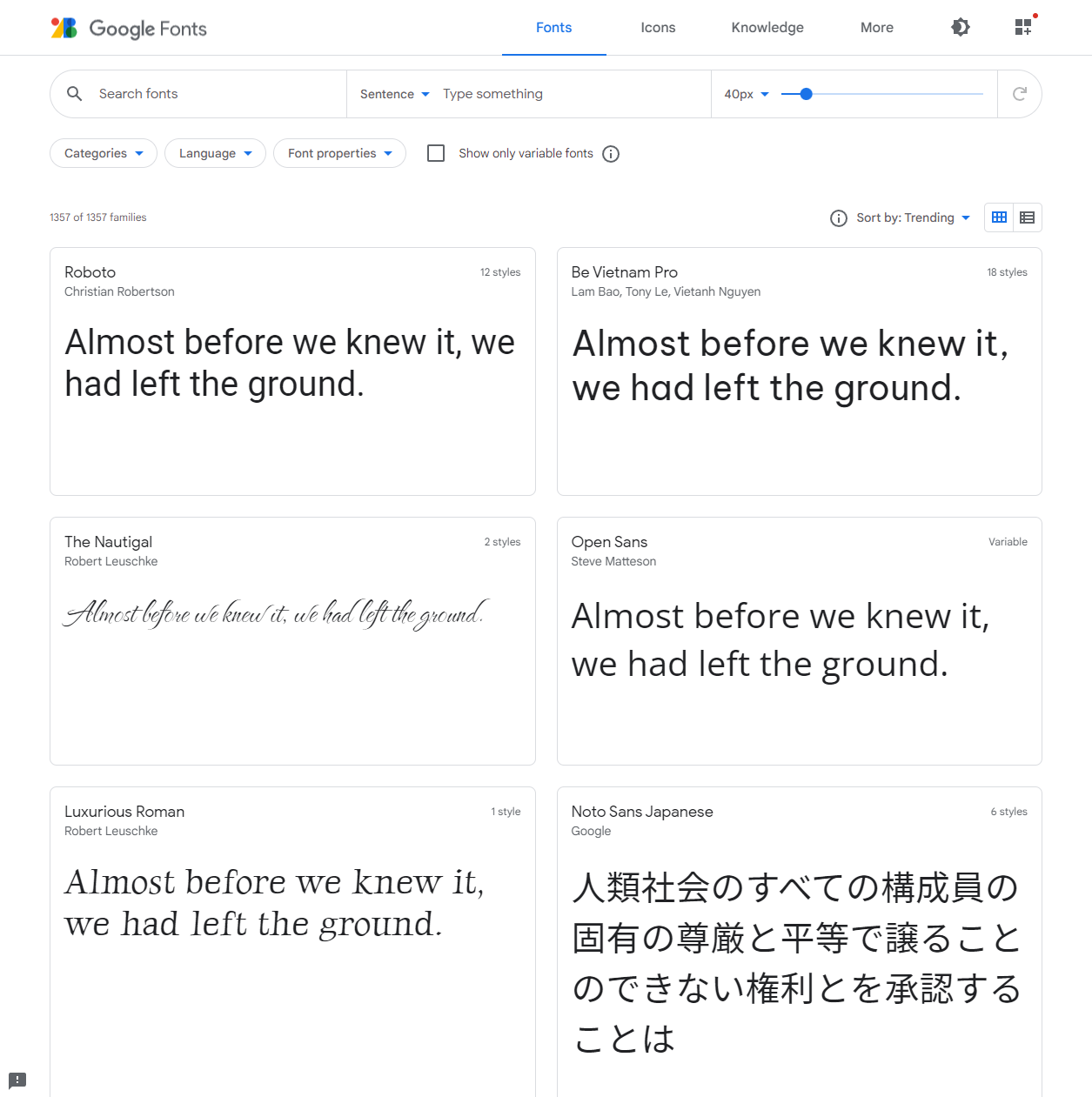 - 좌측 상단에 오면 Search fonts 칸에 내가 원하는 폰트를 검색해서 찾을 수도 있고 그 오른쪽에 Type something이라는 칸에는 내가 원하는 문구를 적으면 프리뷰가 나옵니다. 그 오른쪽에 40px라 적혀 있는 슬라이더가 있는데 그것 역시 조절하면 글자 크기에 따른 프리뷰도 제공하고 있습니다.