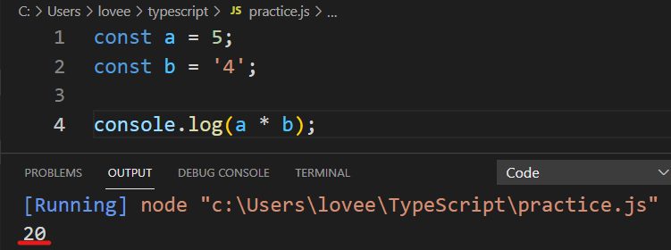 타입스크립트에서는 이 어이없는 결과(20이 나온 결과가 버그입니다.)를 미리 알려줍니다.
