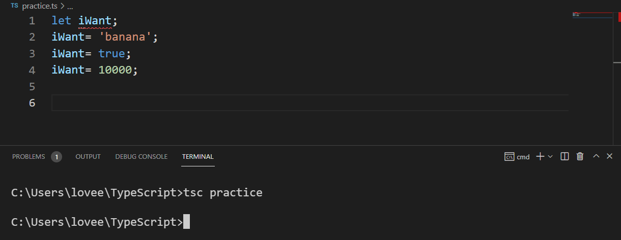 - 변수 'iWant'는 종종 'any'타입으로 쓸 수 있지만 사용도에 맞게 타입을 정해주는 것이 낫다. 라고 말해주고 있네요!