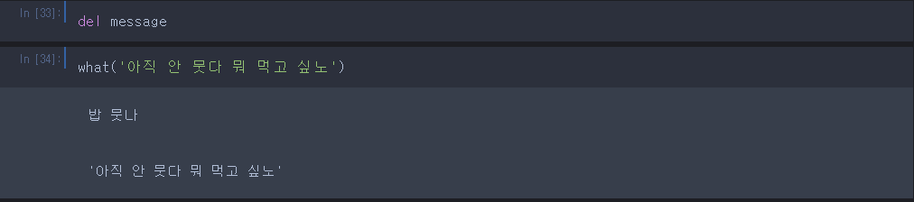 message 함수를 삭제하고 what에 다른 인자 '아직 안 뭇다 뭐 먹고 싶노' 를 넣었더니 아직도 message가 호출되는 소름 돋는 상황이 벌어진다.