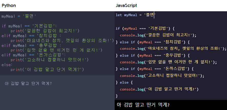 컴퓨터가 위에서 아래로 쭈욱 내려가면서 '기본김밥' "아니네", '참치김밥' "이것도 아니네", '충무김밥' "얘도 아니네", '돈까스김밥' "얘도 아니잖아?" "그럼 else문으로 실행해야겠다."라고 생각해서 '아 김밥 말고 딴 거 먹게?'가 출력이 된 것을 확인할 수 있습니다 ㅎㅎ