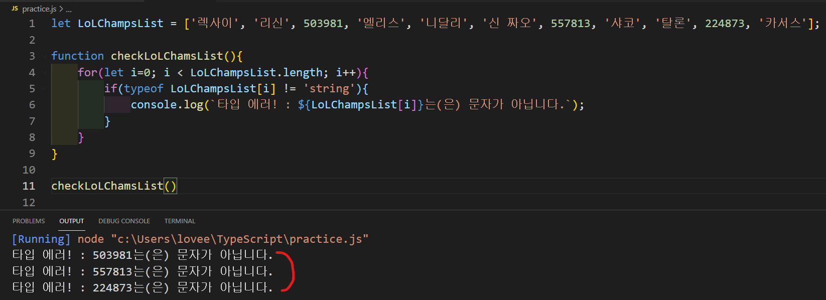 console.log(`타입 에러! : ${LoLChampsList[i]}는(은) 문자가 아닙니다!`);