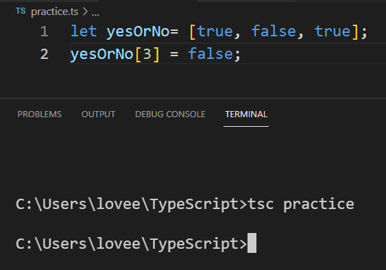 - 첫 번째 에러는 tupYesOrNo[3]의 값이 없기 때문에 타입이 언디파인드입니다. 그래서 타입 'false'는 타입 언티파인드에 선언할 수 없다고 뜹니다. (포스팅의 제일 첫 번째 코드와 상반됩니다. boolean[]타입으로 설정된 배열 클릭 시 이동)
