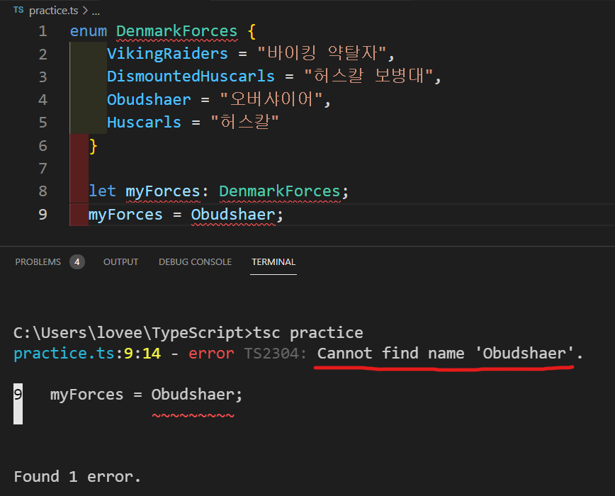 - 다른 타입 선언 때와 마찬가지로 : (colon)을 써주고 그 옆에 타입 DenmarkForces 적어주면 끝입니다.