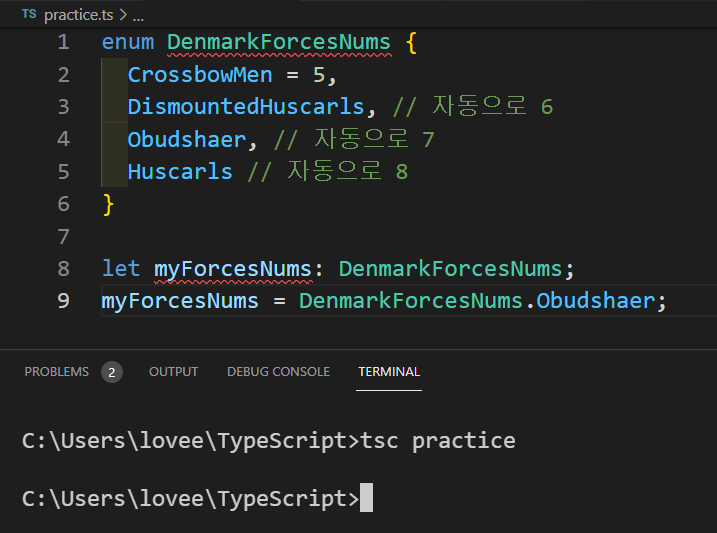 새로운 변수(myForcesNums)를 만들어서 타입을 DenmarkForcesNums을 선언하여 다양한 값을 넣어보겠습니다.