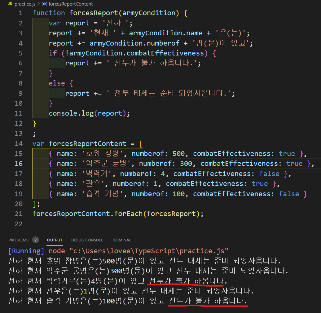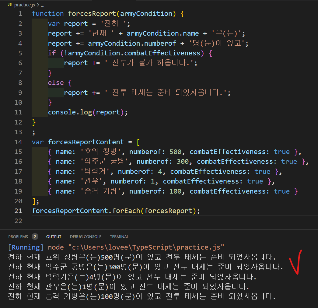 - forcesReport라는 함수를 만들어서 매개 변수로 armyCondition을 만들고 타입을 순서대로 이름에 문자, 병력 수에 숫자, 전투준비태세에 불린을 넣어주었습니다. 그리고 함수 forcesReport는 리턴값이 따로 없기 때문에 void로 타입을 설정해줍니다.(안 해도 됨)