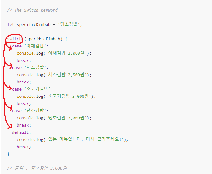 - break은 영어 사전에 찾아보면 쉬다, 중단시키다 등등 뜻이 많죠? 여기서는 '참인 값을 찾았으면 그 코드 블록을 빠져나가!'라는 뜻입니다. 예를 들어 위의 코드에서 break을 쓰지 않는다면, 컴퓨터가 '땡초김밥'이라는 참인 값을 찾고도 코드 블록을 빠져나가지 못해 default 값까지 출력을 시켜버립니다.