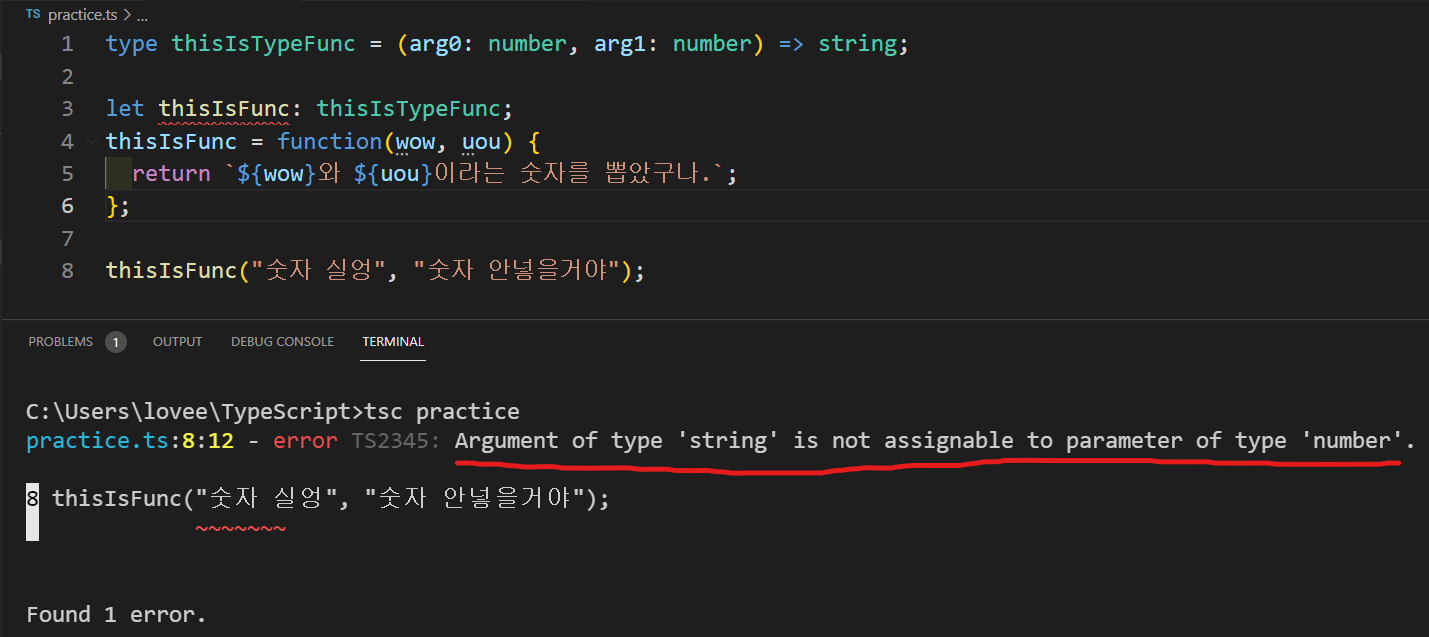 - 타입 '(wow: number, uou: number)=> number'은 타입 에일리어스인 'thisIsTypeFunc'에 선언할 수 없다.