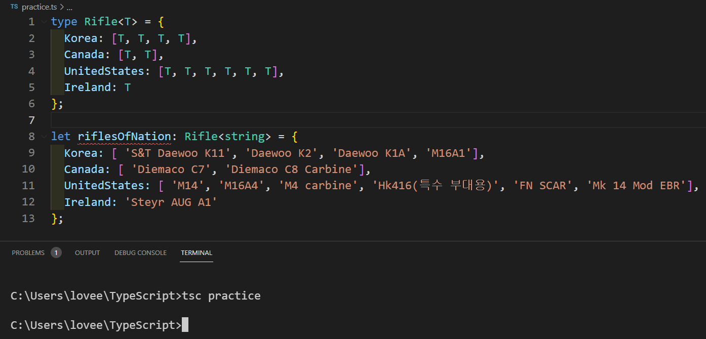 한국, 캐나다, 미국, 아일랜드의 주력 소총을 나타내는 객체를 만들기 위해 타입을 선언해주겠습니다.