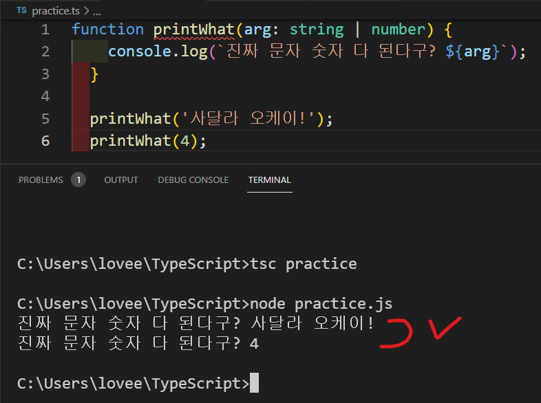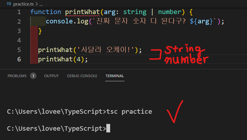 - 타입을 선언 할 때 선언하고자 하는 타입들 사이에 | 수직선 기호(Vertical line)를 넣어주면 끝~