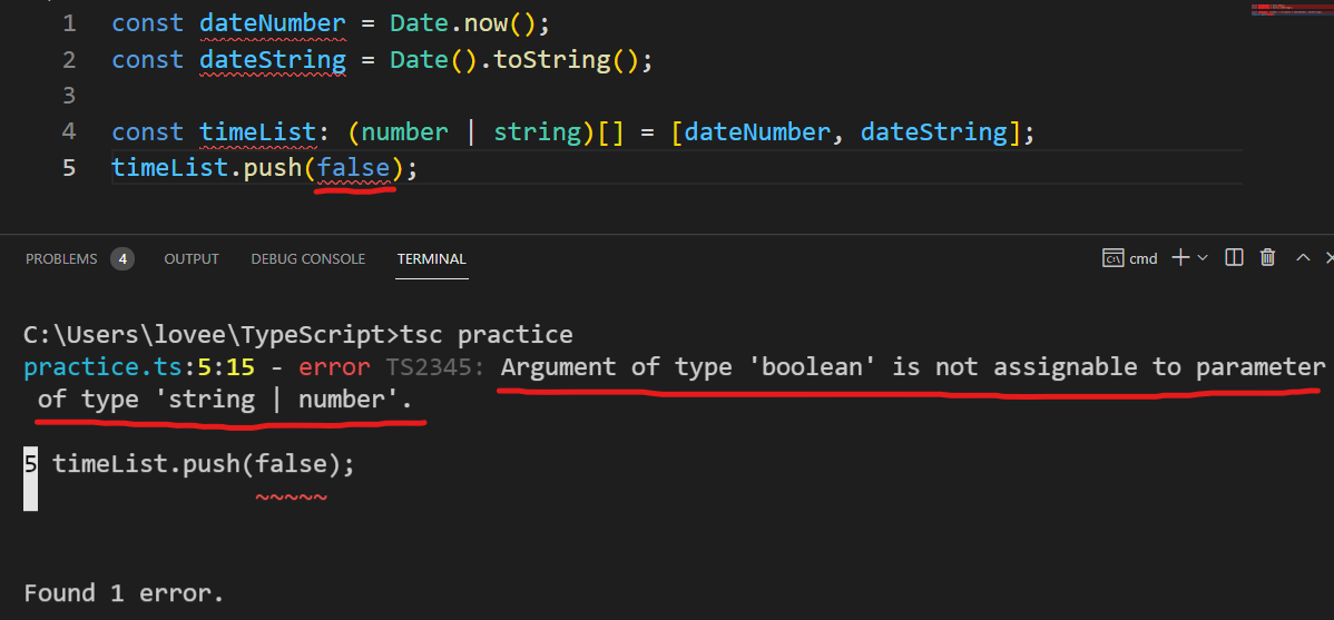 - 유니온 타입을 배열에 선언할 때의 주의할 점은 number와 string을 반드시 ( ) (parentheses)에 넣어주어야 합니다. 왜냐하면 number | string[]로 타입을 선언할 경우 string에만 배열이 적용되기 때문에 배열 안에 숫자가 들어가면 에러가 발생합니다. (아래의 스샷이 증거)