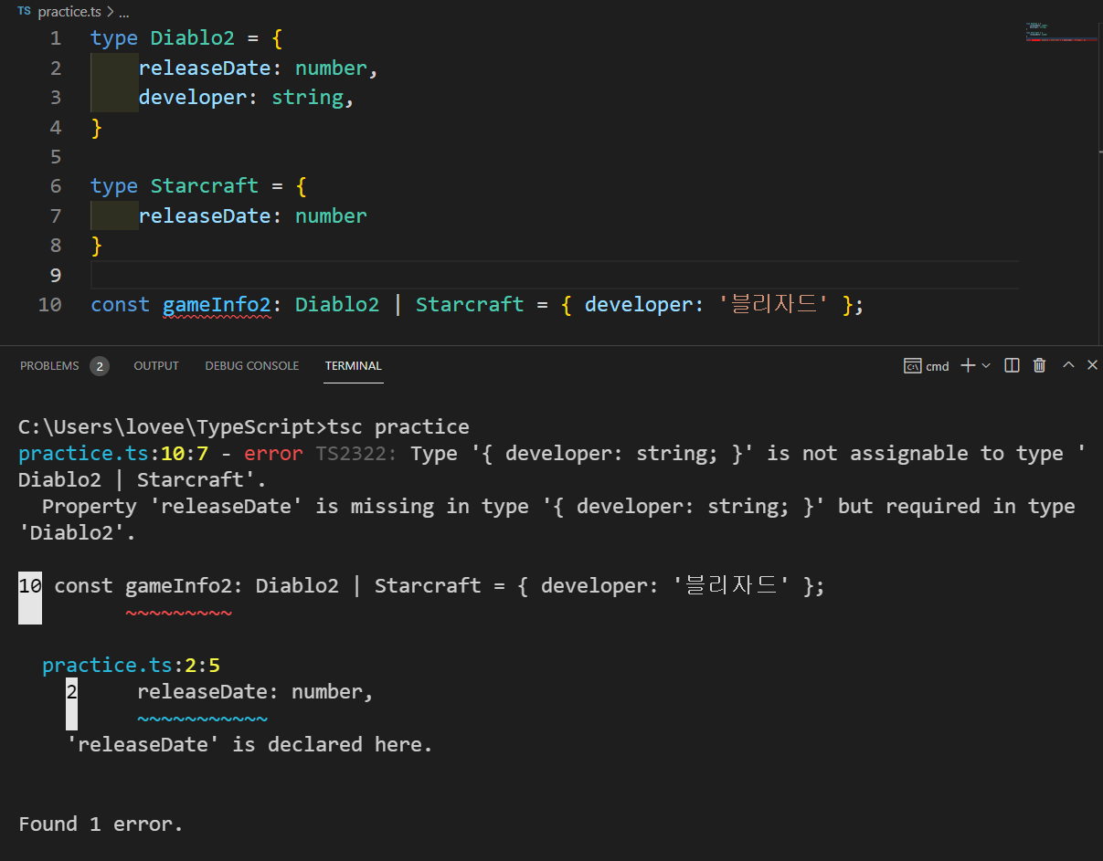 - gameInfo2라는 변수를 만들어 타입 Diablo2 | Starcraft인 유니온 타입으로 선언을 하고 값을 { developer: '블리자드' }로 선언하면 에러가 납니다.