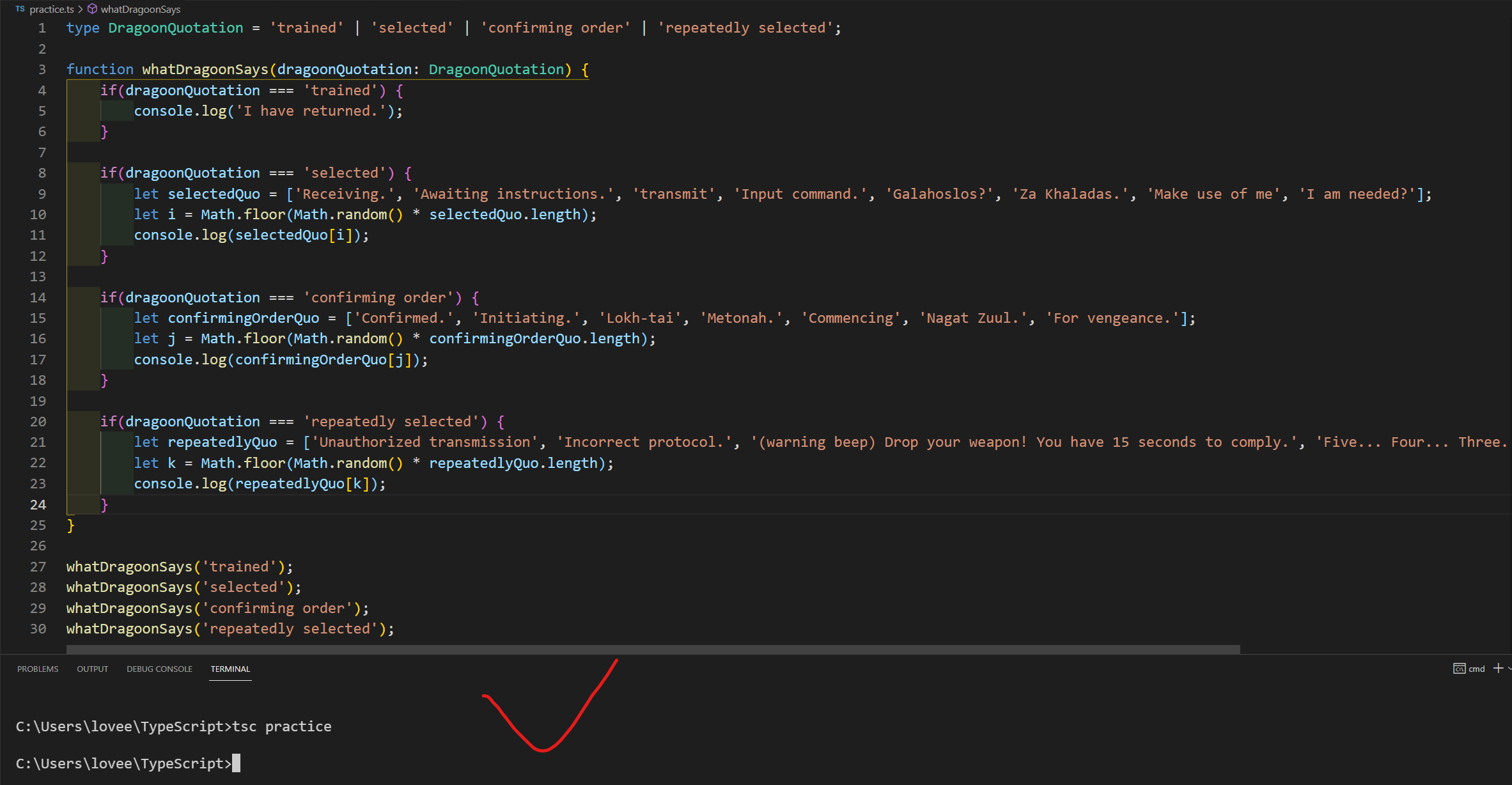 function whatDragoonSays(dragoonQuotation: DragoonQuotation) {