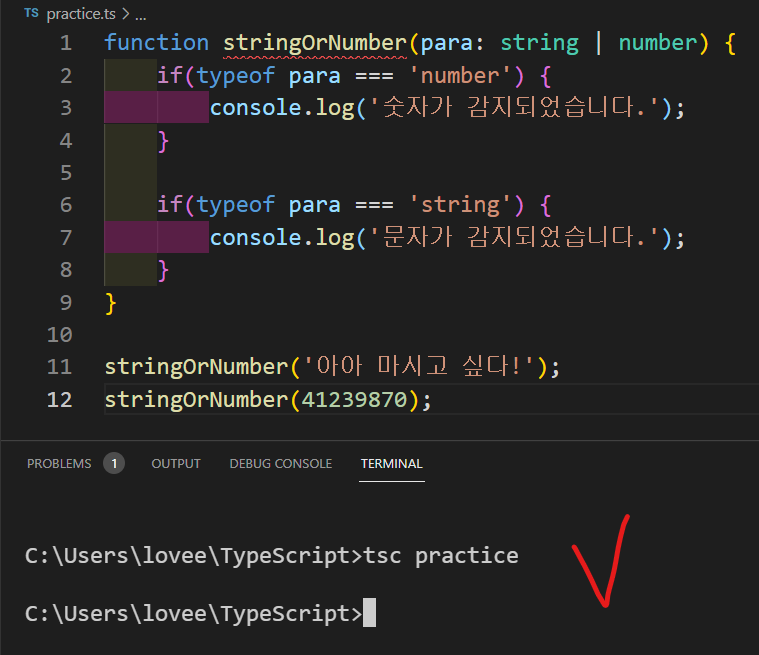 - 함수 whatever을 선언하는데 매개 변수로는 what을 사용하고 what의 타입은 유니온으로 string과 number입니다.