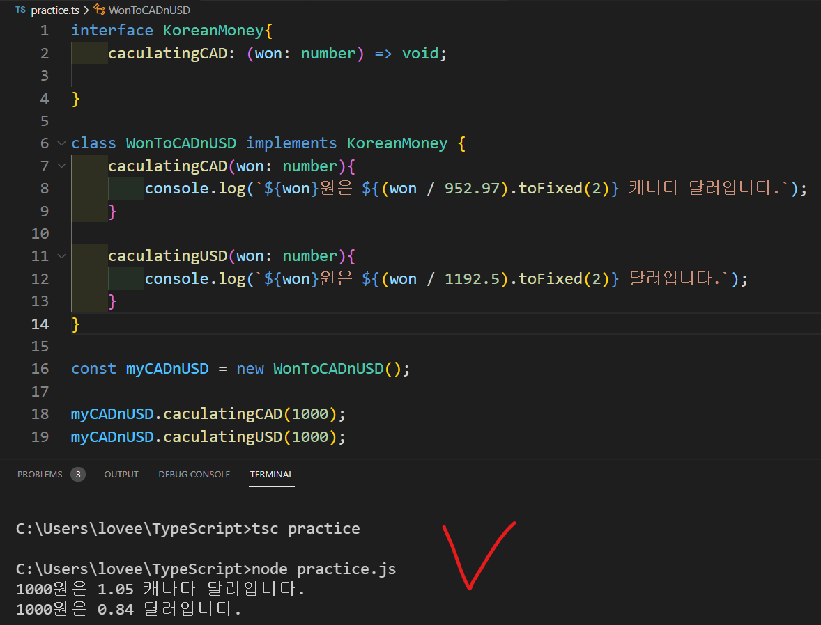 - KoreanMoney라는 인터페이스를 만들고 caculatingCAD라는 메서드를 만들고 매개 변수로 won, 타입은 number를 주었고 리턴값은 없기 때문에 void로 설정했습니다.