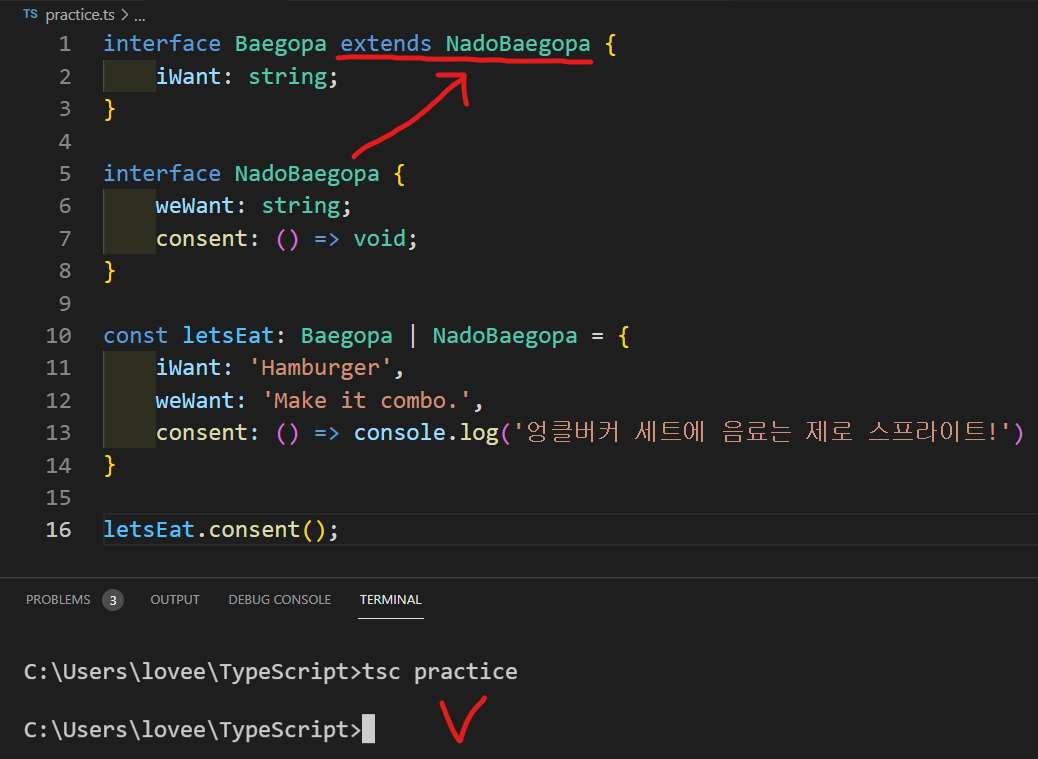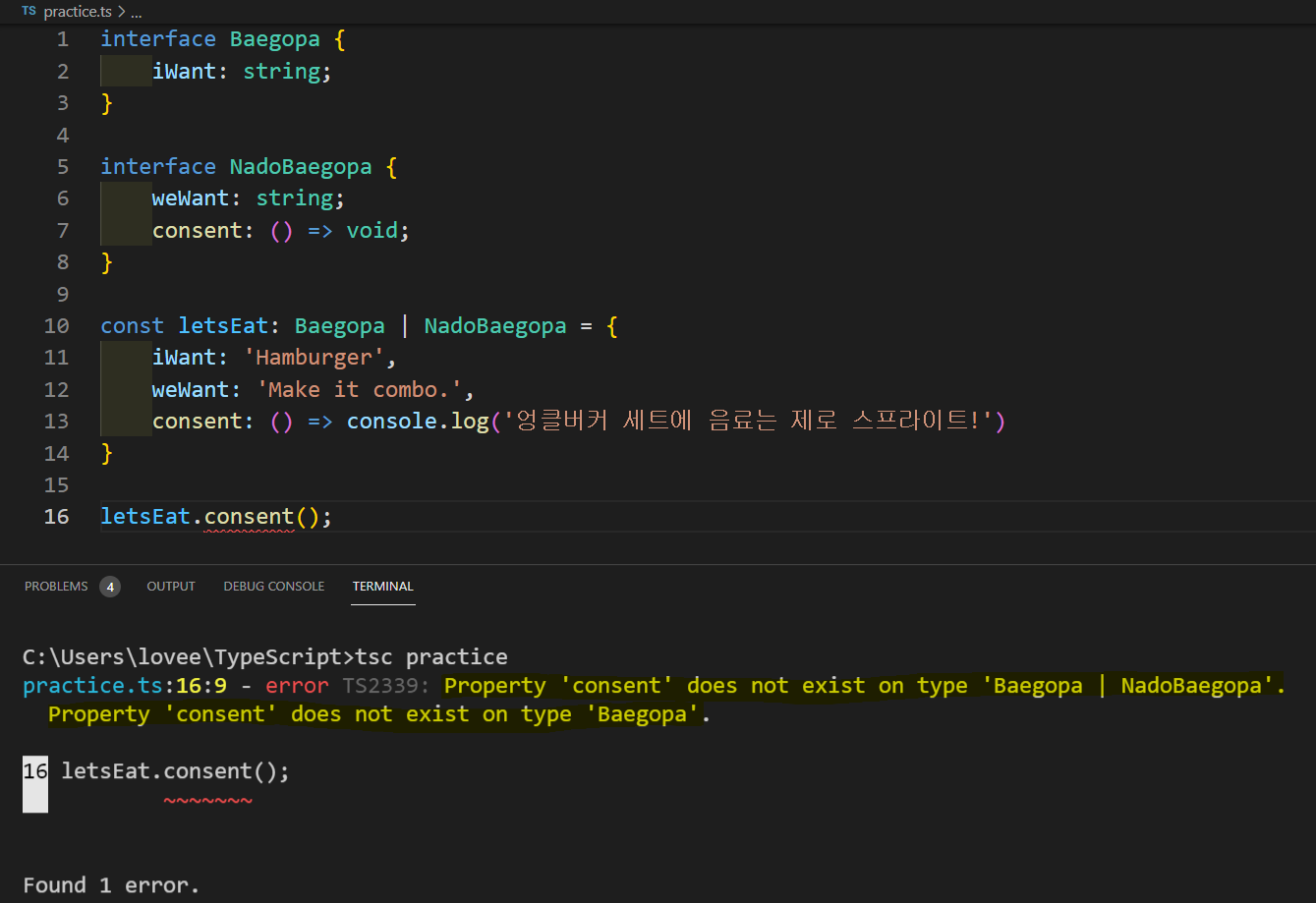 - 그렇습니다. 타입 NadoBaegopa도 역시 letsEat에 타입 선언이 되어야 하는 것입니다.