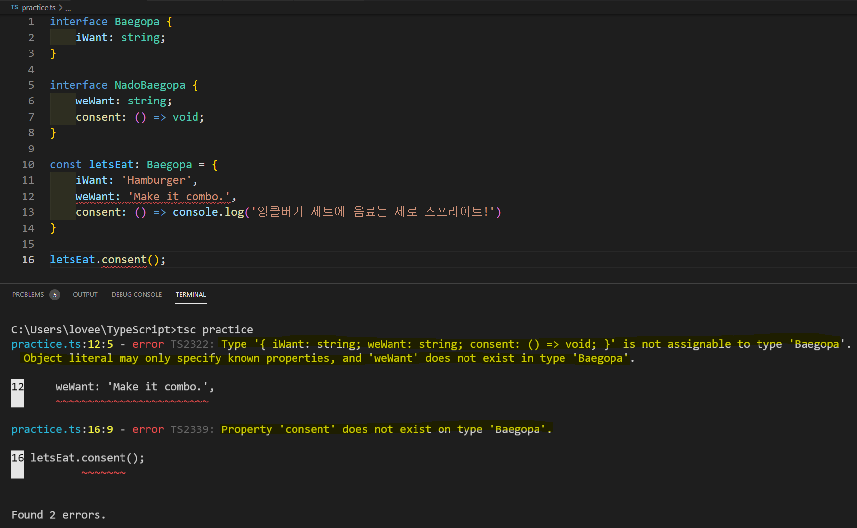 - 객체 리터럴은 알려진 프로퍼티에만 명시할 수 있고 'weWant'는 타입 'Baegopa'에 존재하지 않는다.