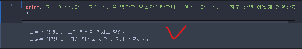 또 다른 방법으로는 """ """ 세 개의 큰따옴표를 쓰는 방법입니다. 세 개의 큰따옴표는 여러 줄의 문자열을 만들 때도 사용합니다. (물론 ''' ''' 작은따옴표 세 개도 가능합니다.)