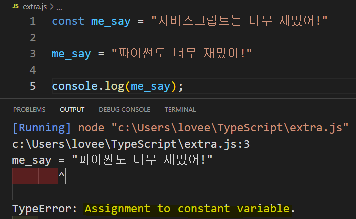 자바스크립트에서는 const로 변수를 설정하면 재선언이 불가능합니다. (var, let은 가능)