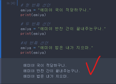 me_say = "파이썬은 너무 재밌어!" # 변수를 선언하고