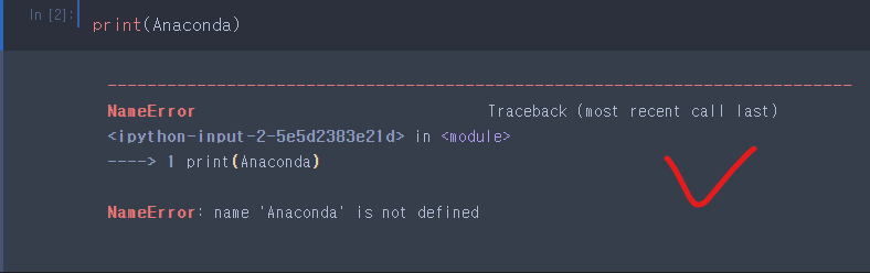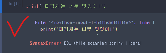 파이썬에서는 에러가 생기면 ^ 표시로 에러가 발생한 지점을 찾아줍니다.