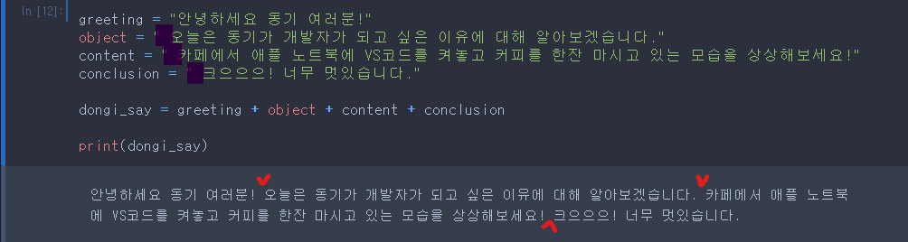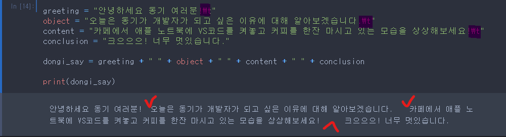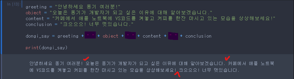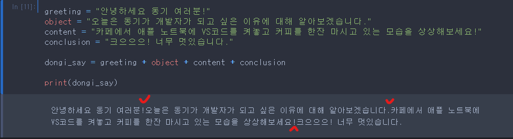 - 각각의 변수를 + 연산자로 연속되게 한 다음 변수 dongi_say에 선언했습니다.