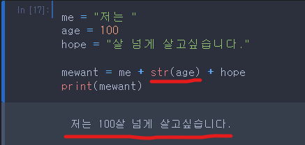 변수에 문장을 넣어 놓고 불러와서 문장을 이어줄 수 있습니다. 아래의 코드를 봅시다.