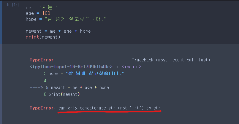 - 위와 같이 문자와 숫자를 같은 변수에 넣고 출력을 하면 아래와 같은 에러가 나옵니다.