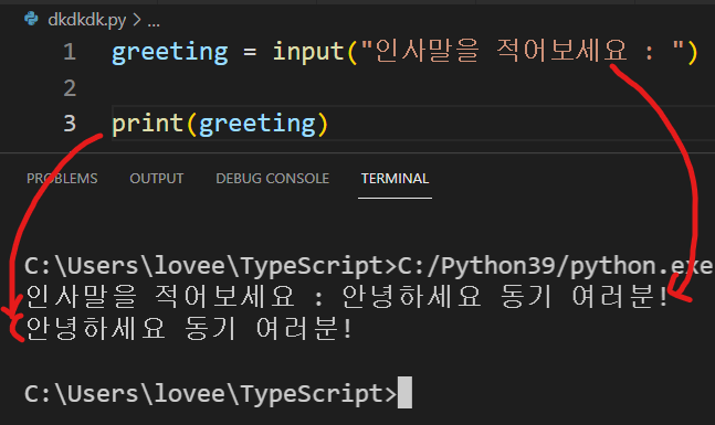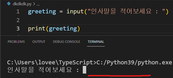 - greeting이라는 변수를 만들고 input() 함수 안에 "인사말을 적어보세요: "라는 안내문(?)도 넣을 수 있습니다. 이 안내문은 프로그램이 사용자를 위해 출력해줍니다.