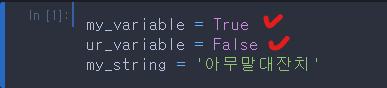 코드 에디터에서 True나 False를 쳐본 사람들은 아시겠지만 다른 변수나 문자열과 다르게 색도 다르고 맨 앞글자가 대문자인 것을 눈치채셨을 겁니다.