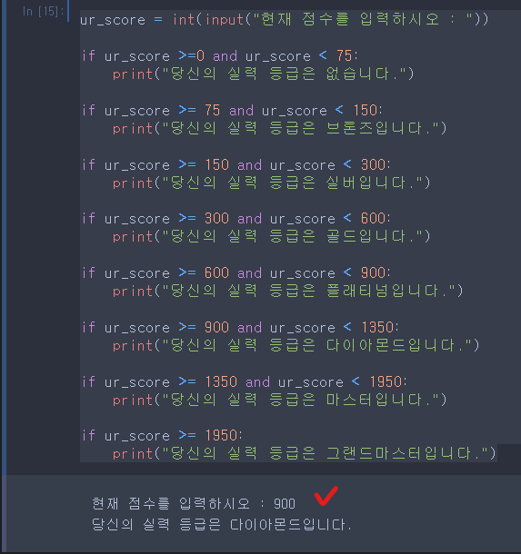 - 만약에 ur_score이 0보다 크거나 같고 and(그리고) ur_score이 75보다 작다면 "당신의 실력 등급은 없습니다."