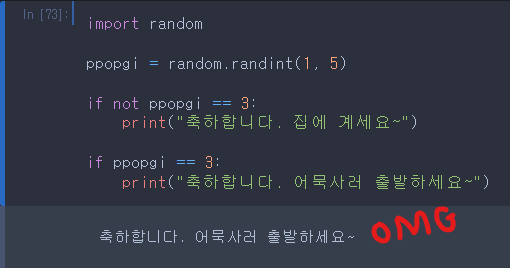 - if 뽑기가 3이라면 참이기 때문에 "축하합니다. 어묵 사러 출발하세요~"를 출력하게 설정