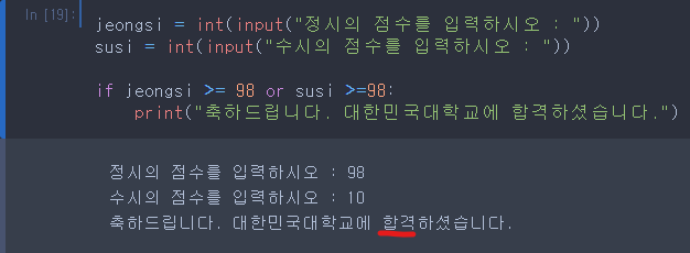 대한민국 대학교라는 곳이 있는데 이 대학은 정시 또는 수시의 점수가 98점 이상이라면 합격할 수 있습니다. 이에 관한 코드를 짜 보겠습니다.