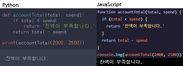 accountTotal이라는 함수에 total, spend라는 매개변수(parameter)를 넣고 return을 써주어 '값을 돌려줘라'라고 명령도 넣고 total - spend를 한 후에 식별자(Identifier)인 acountTotal로 실행을 시키되 독립변수(Argument)에는 각각 10000과 2500을 넣었습니다. 그랬더니 7500이 나오죠?