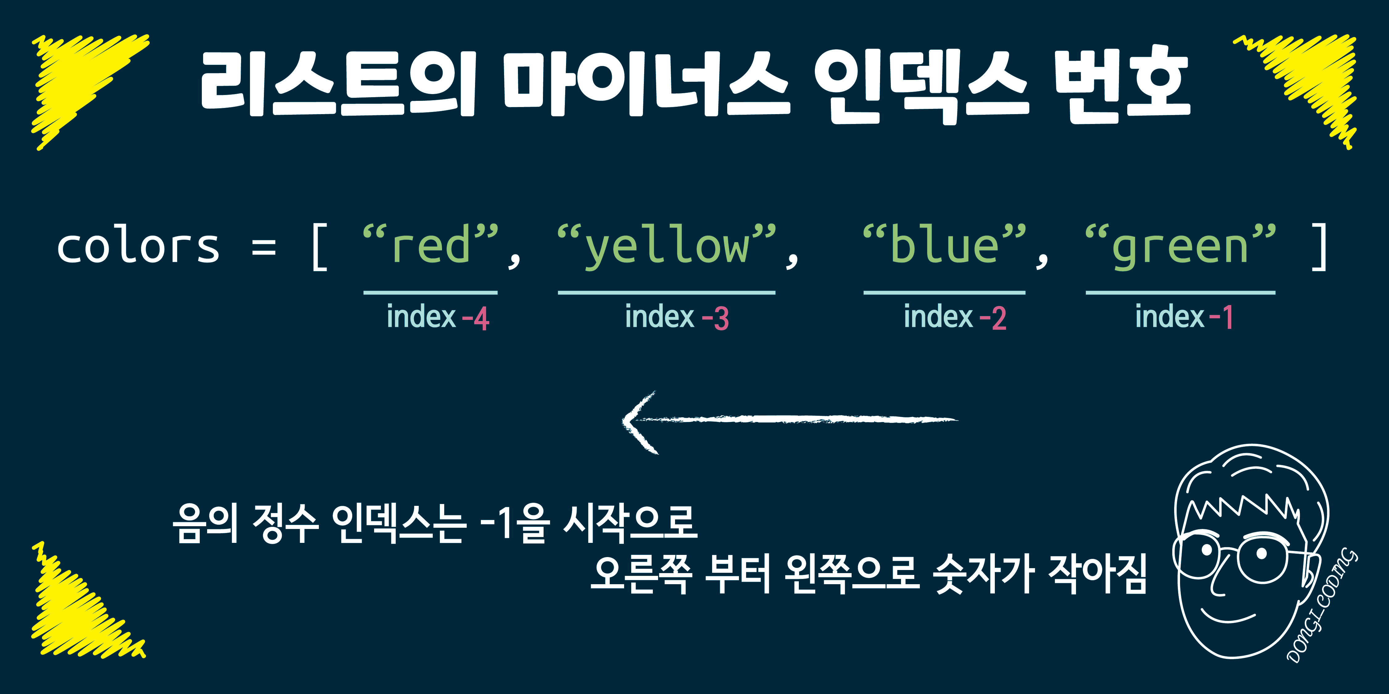 인덱스는 양의 정수도 있지만 음의 정수의 인덱스도 존재합니다. 음의 정수 인덱스는 오른쪽부터 -1으로 시작합니다.